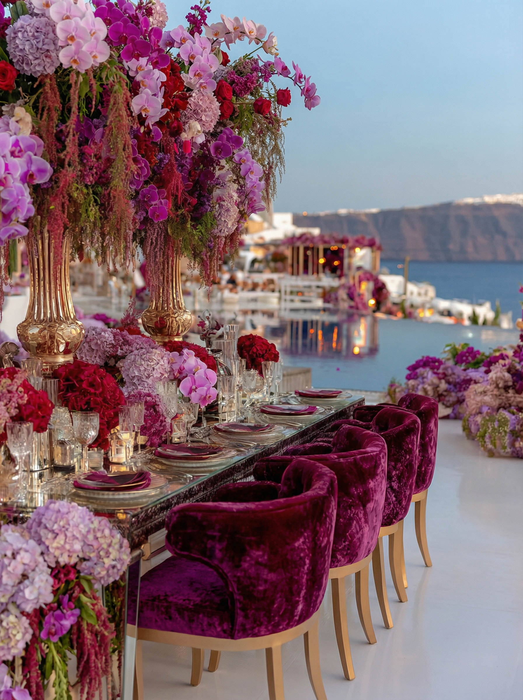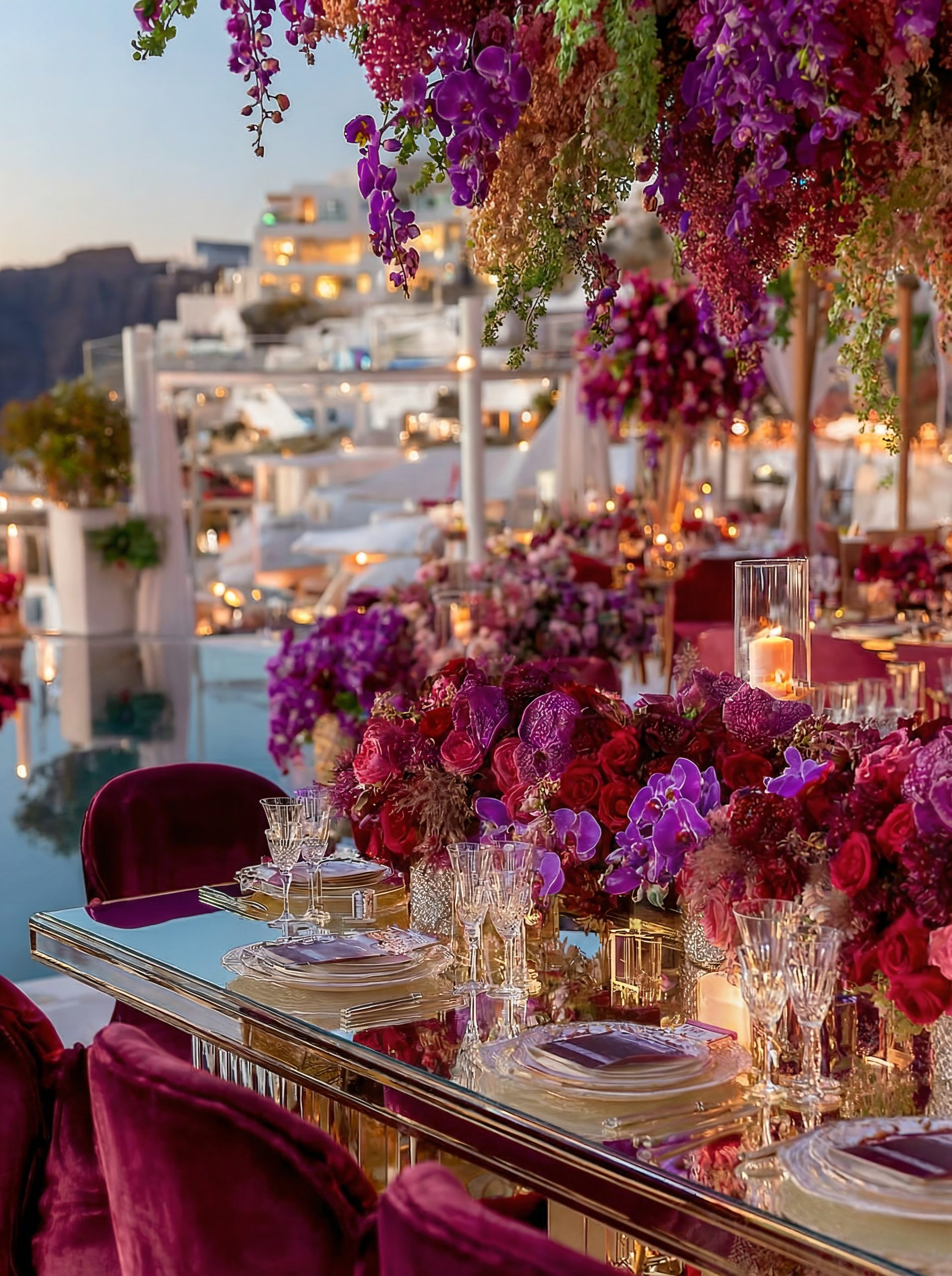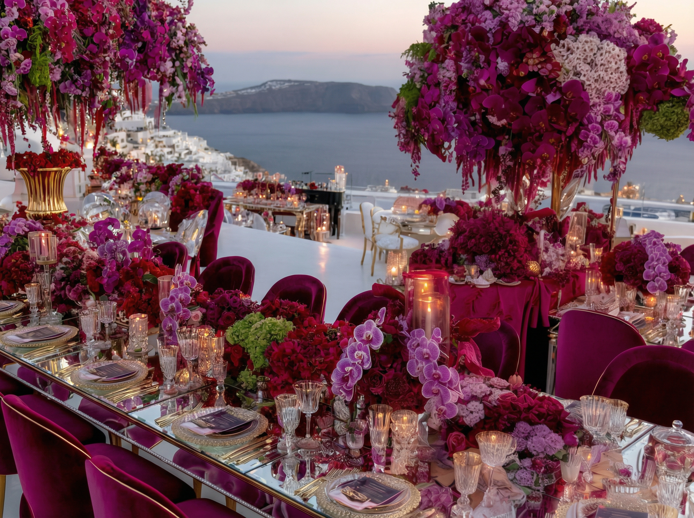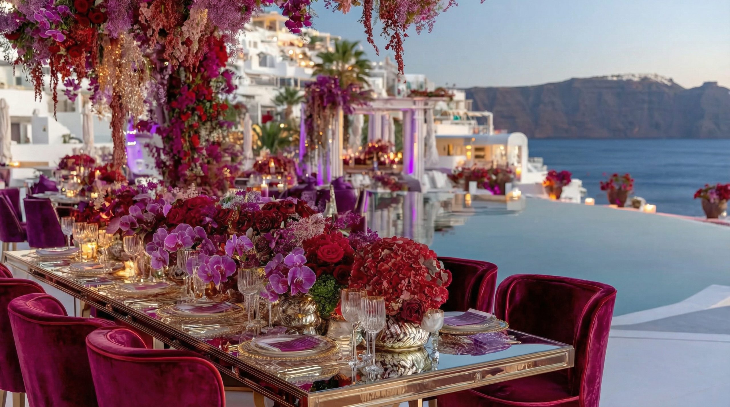 In Santorini, love is written in technicolor. Facing the endless blue of the caldera, beneath a dramatic floral arch of deep roses and rich crimson tones, vows are whispered in the glow of the Aegean light. Getting married in Greece here is not a ceremony, it is a work of art. As the day fades, the reception becomes a statement. Velvety reds, bold fuchsia and deep plum tones converse with subtle gold accents and crystal-clear glassware. Sculptural orchids float in the evening air, while candlelight creates a warm, cinematic atmosphere suspended between sky and sea. In Santorini, décor never competes with the landscape. It accompanies it. It elevates it. And because true luxury dares to break the rules, tradition gives way to audacity: a sculptural red couture gown set against the infinite blue. A symbol of freedom, elegance, and the belief that love should always choose the extraordinary. In Greece, love follows no rules. It is lived, intensely.