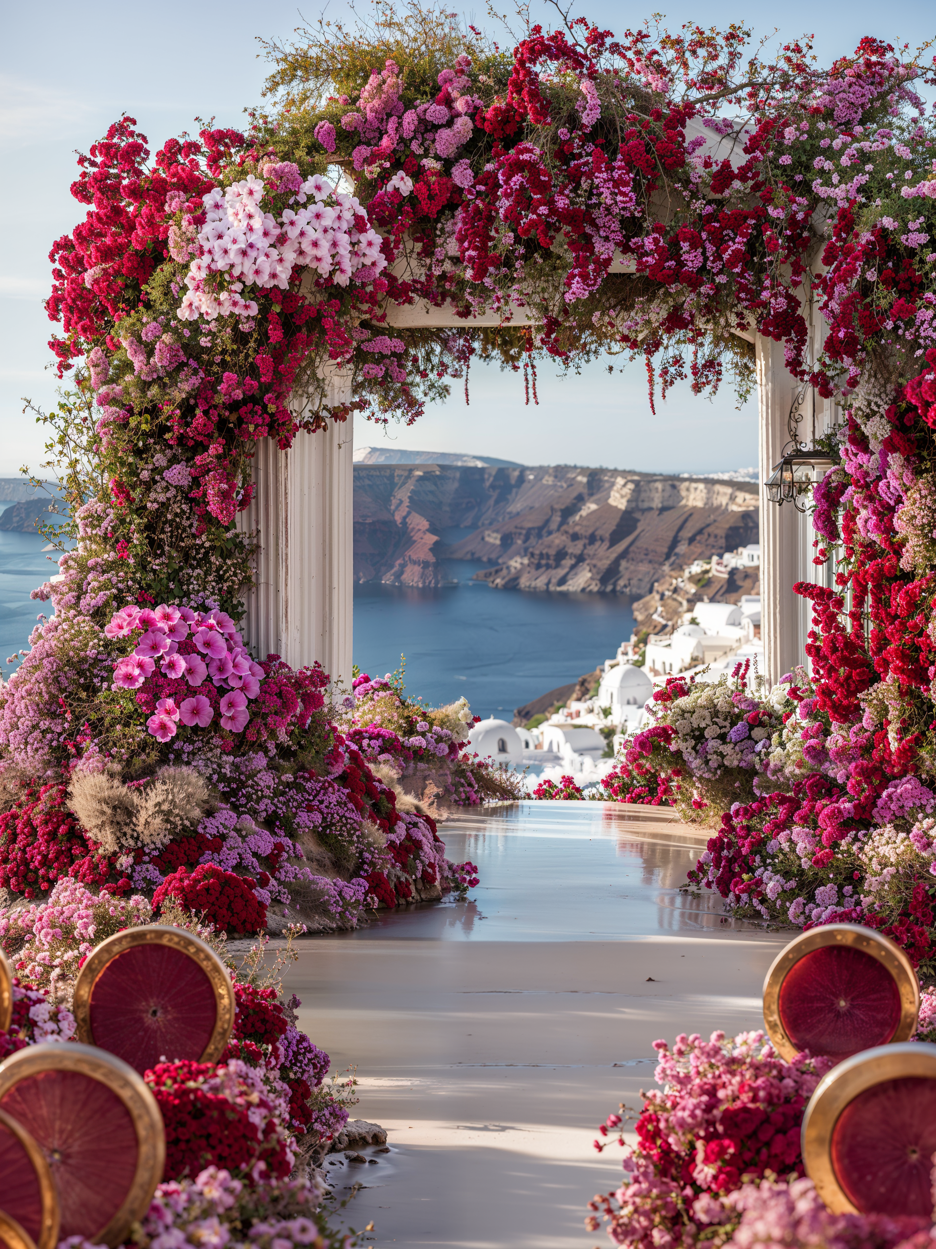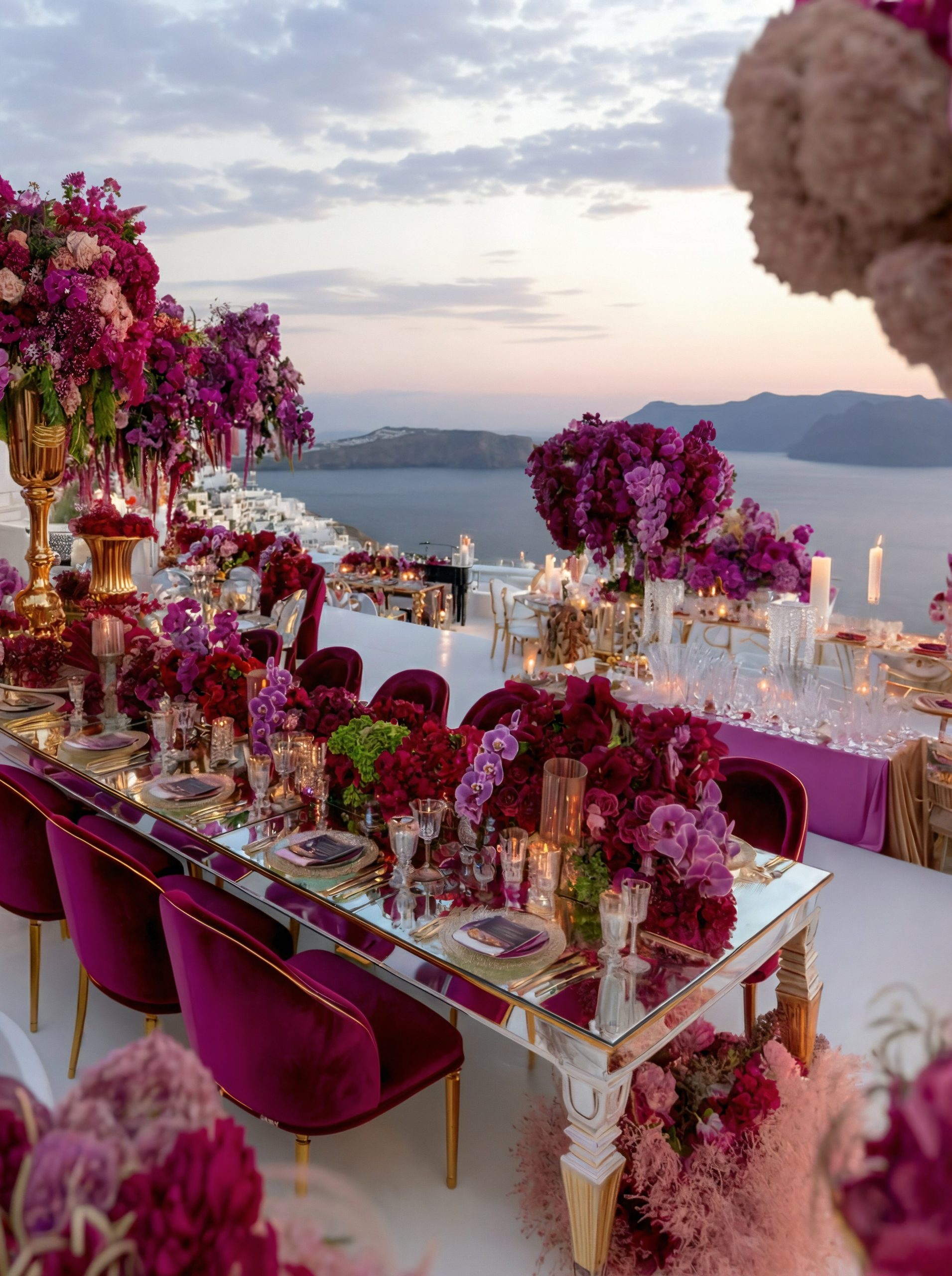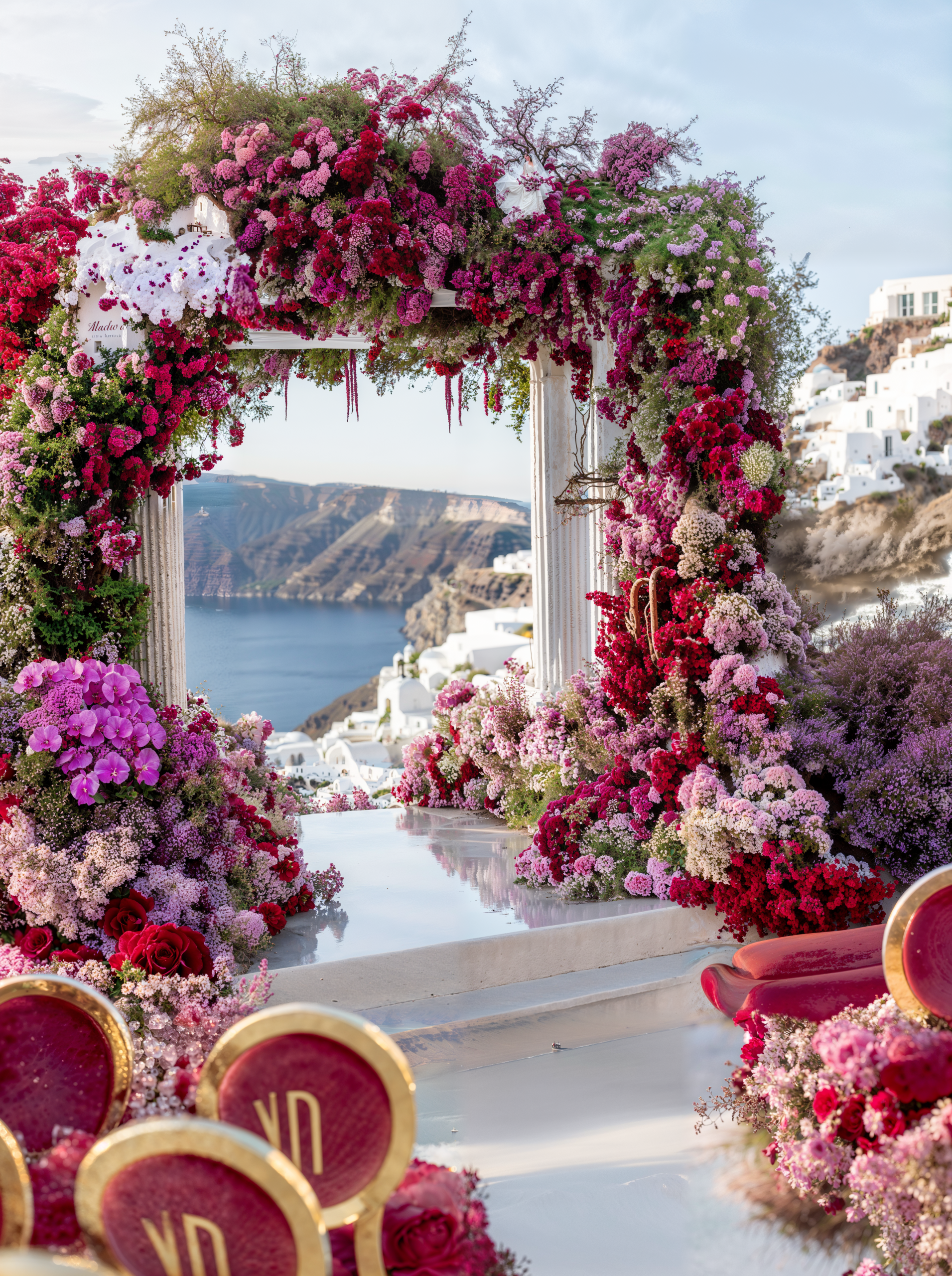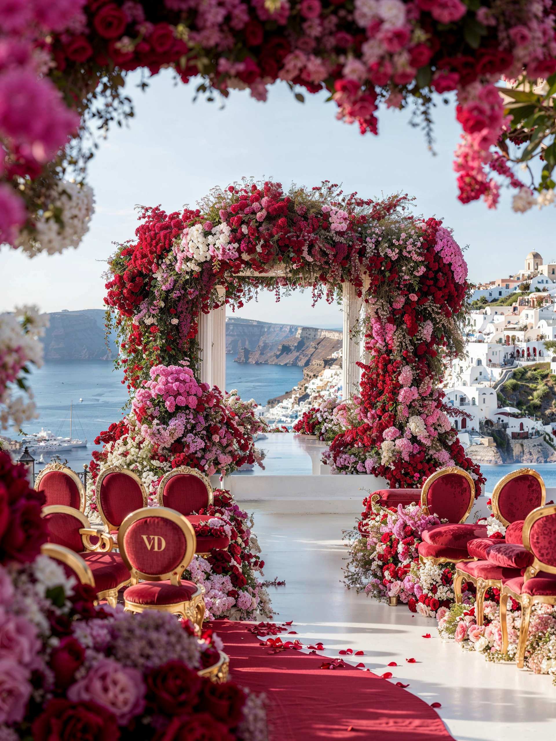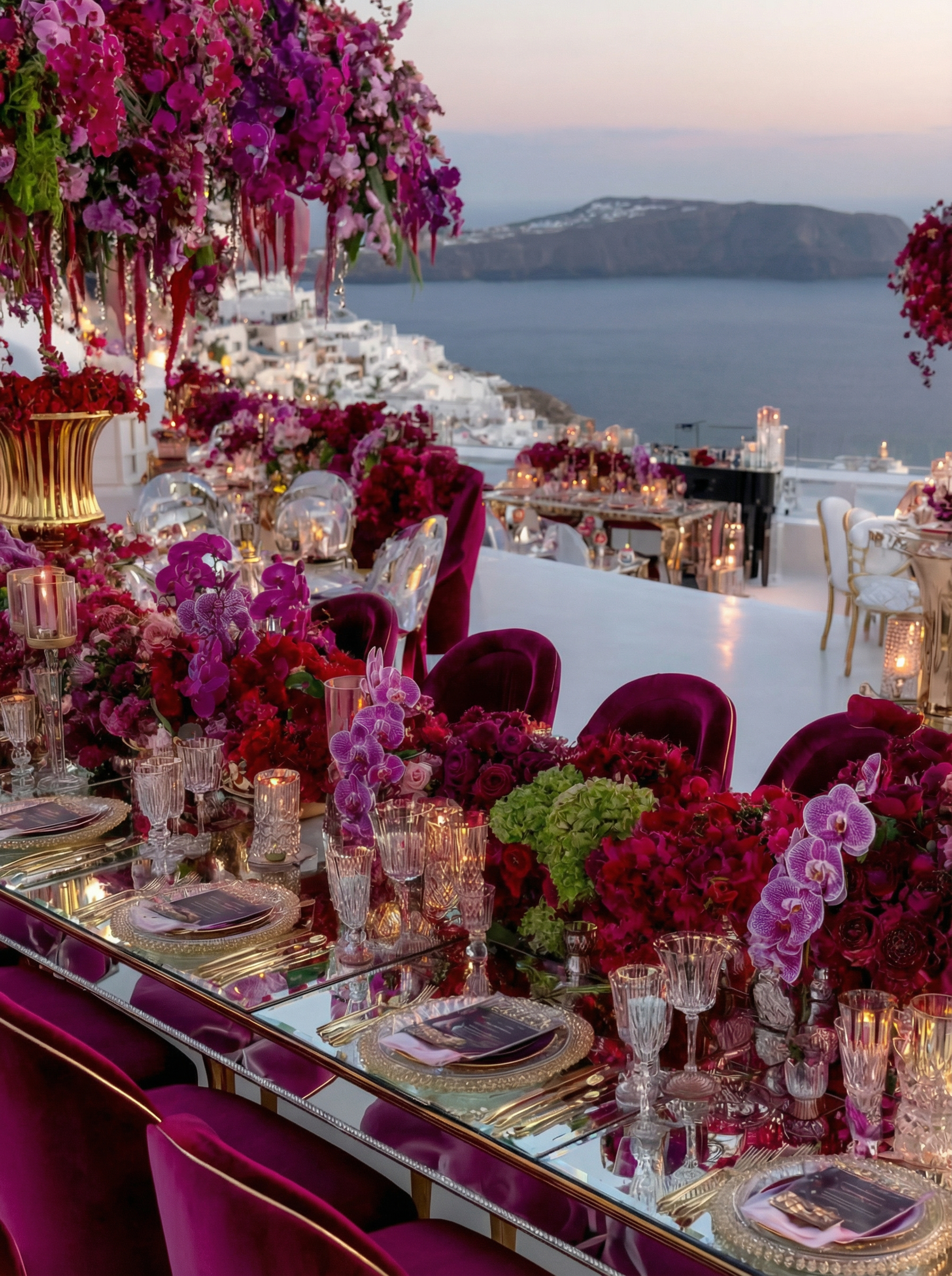 In Santorini, love is written in technicolor. Facing the endless blue of the caldera, beneath a dramatic floral arch of deep roses and rich crimson tones, vows are whispered in the glow of the Aegean light. Getting married in Greece here is not a ceremony, it is a work of art. As the day fades, the reception becomes a statement. Velvety reds, bold fuchsia and deep plum tones converse with subtle gold accents and crystal-clear glassware. Sculptural orchids float in the evening air, while candlelight creates a warm, cinematic atmosphere suspended between sky and sea. In Santorini, décor never competes with the landscape. It accompanies it. It elevates it. And because true luxury dares to break the rules, tradition gives way to audacity: a sculptural red couture gown set against the infinite blue. A symbol of freedom, elegance, and the belief that love should always choose the extraordinary. In Greece, love follows no rules. It is lived, intensely.