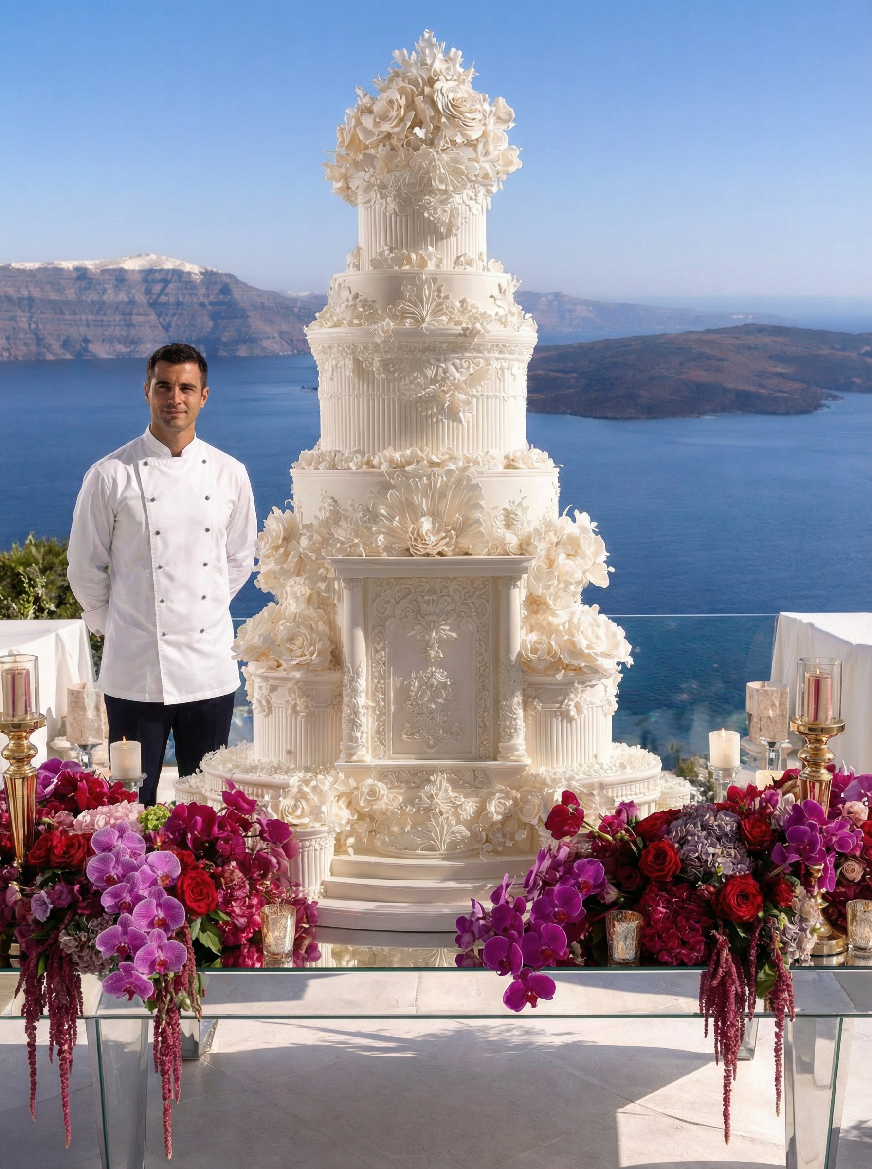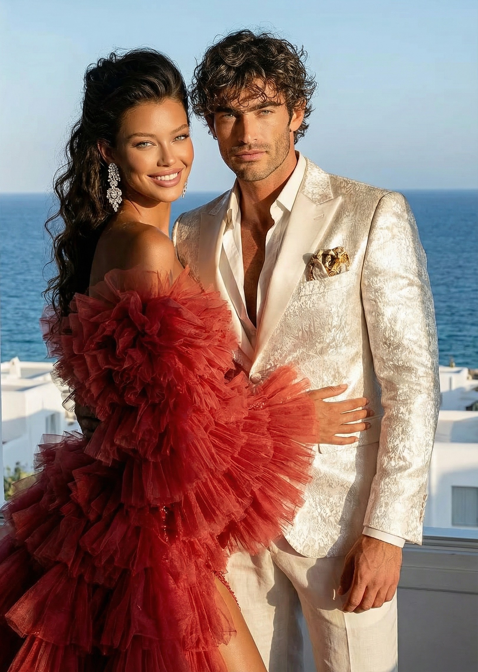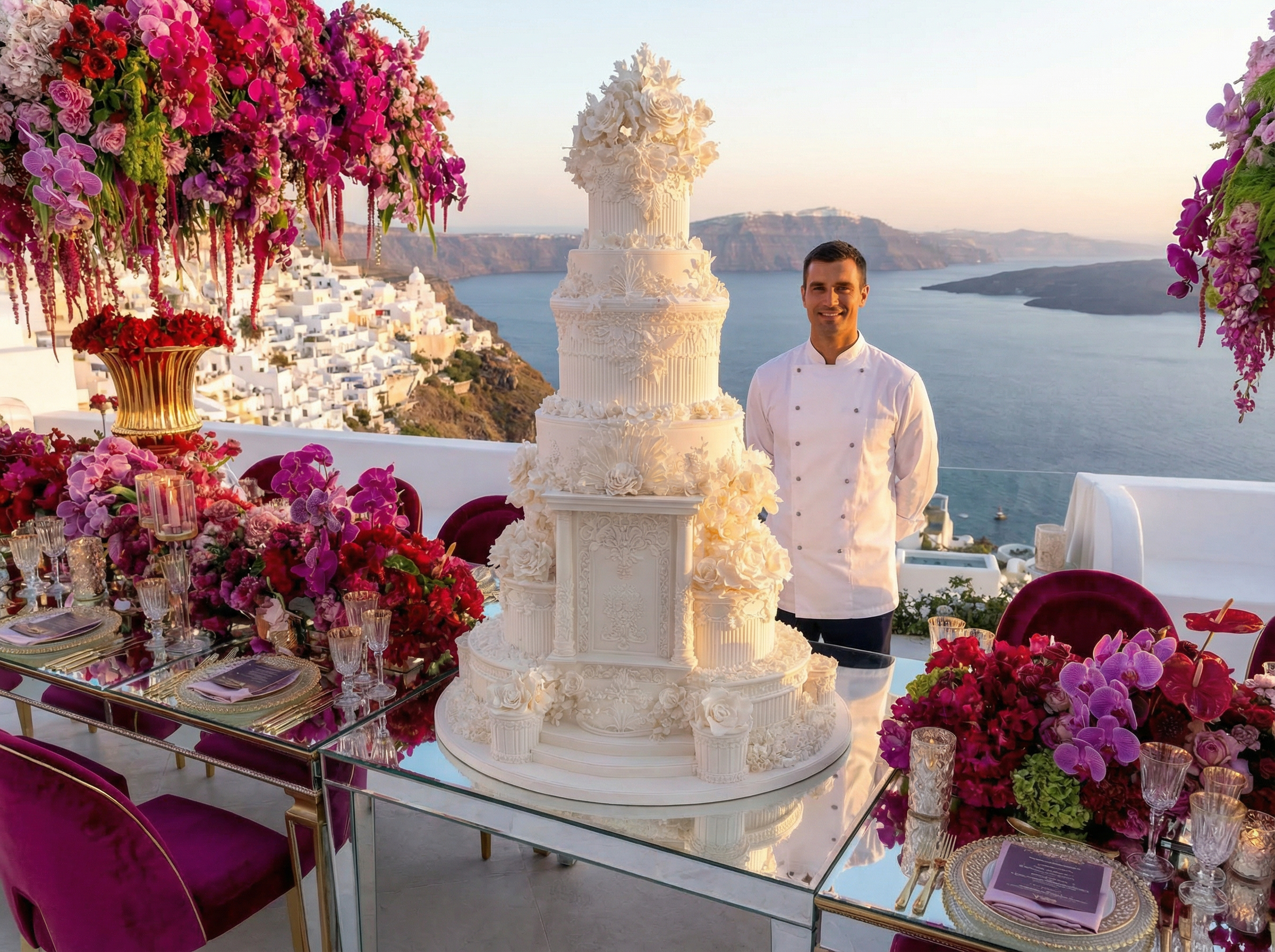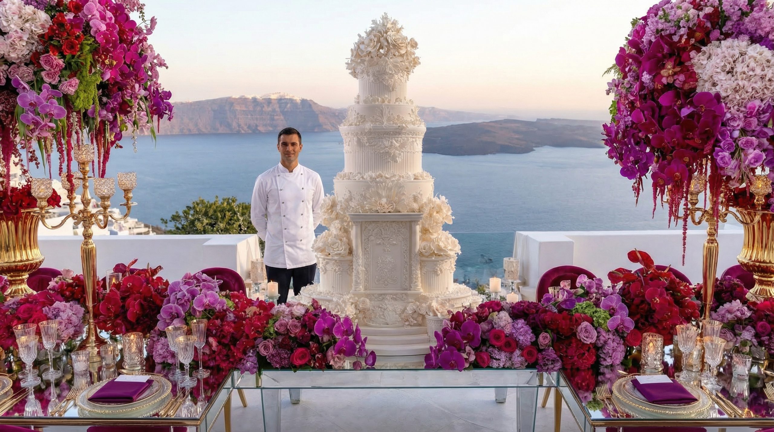In Santorini, love is written in technicolor. Facing the endless blue of the caldera, beneath a dramatic floral arch of deep roses and rich crimson tones, vows are whispered in the glow of the Aegean light. Getting married in Greece here is not a ceremony, it is a work of art. As the day fades, the reception becomes a statement. Velvety reds, bold fuchsia and deep plum tones converse with subtle gold accents and crystal-clear glassware. Sculptural orchids float in the evening air, while candlelight creates a warm, cinematic atmosphere suspended between sky and sea. In Santorini, décor never competes with the landscape. It accompanies it. It elevates it. And because true luxury dares to break the rules, tradition gives way to audacity: a sculptural red couture gown set against the infinite blue. A symbol of freedom, elegance, and the belief that love should always choose the extraordinary. In Greece, love follows no rules. It is lived, intensely.